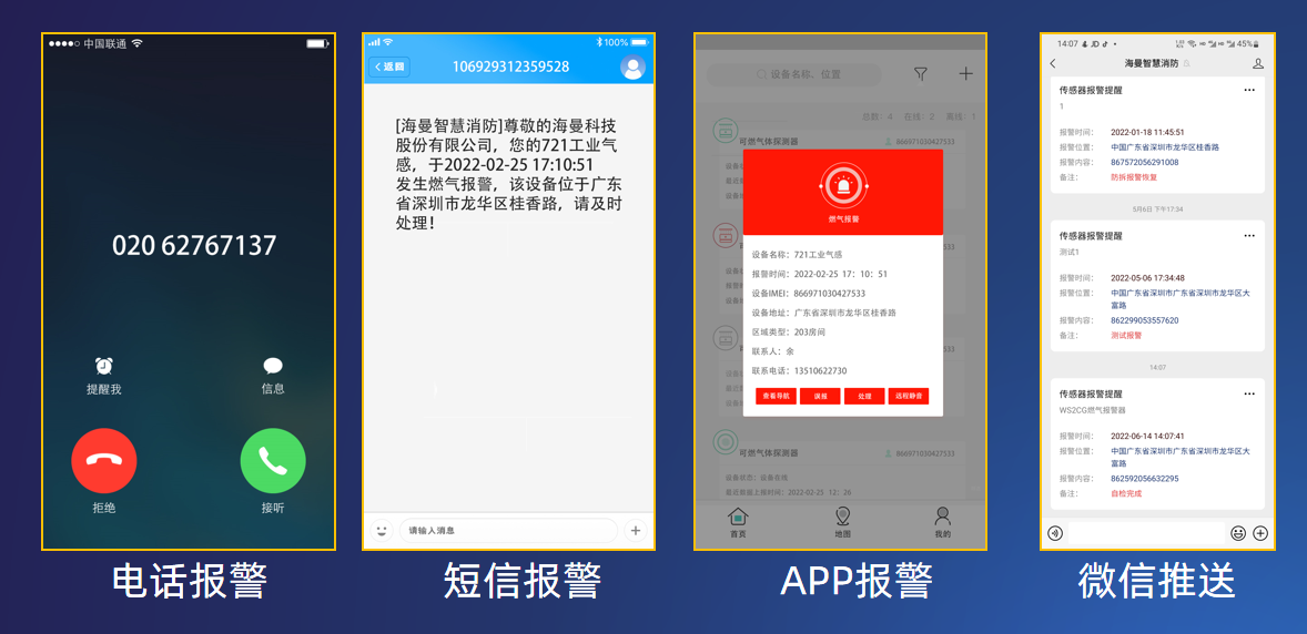 設(shè)備監(jiān)測(cè)到氣體泄露后,會(huì)同時(shí)通過平臺(tái)彈窗、平臺(tái)警報(bào)聲、電話、短信、APP報(bào)警、微信推送方式通知用戶,而且電話可以同時(shí)分享給多人,把報(bào)警信息通知給安全負(fù)責(zé)人以及用戶端。