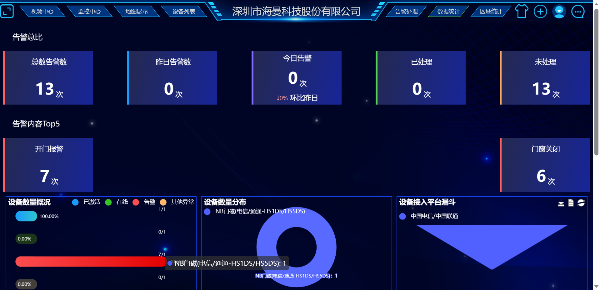 平臺(tái)的首頁展示包含監(jiān)測(cè)設(shè)備的總數(shù)、故障數(shù)統(tǒng)計(jì)、設(shè)備在線數(shù)統(tǒng)計(jì)、報(bào)警曲線圖、報(bào)警時(shí)段統(tǒng)計(jì)、最新報(bào)警信息等。